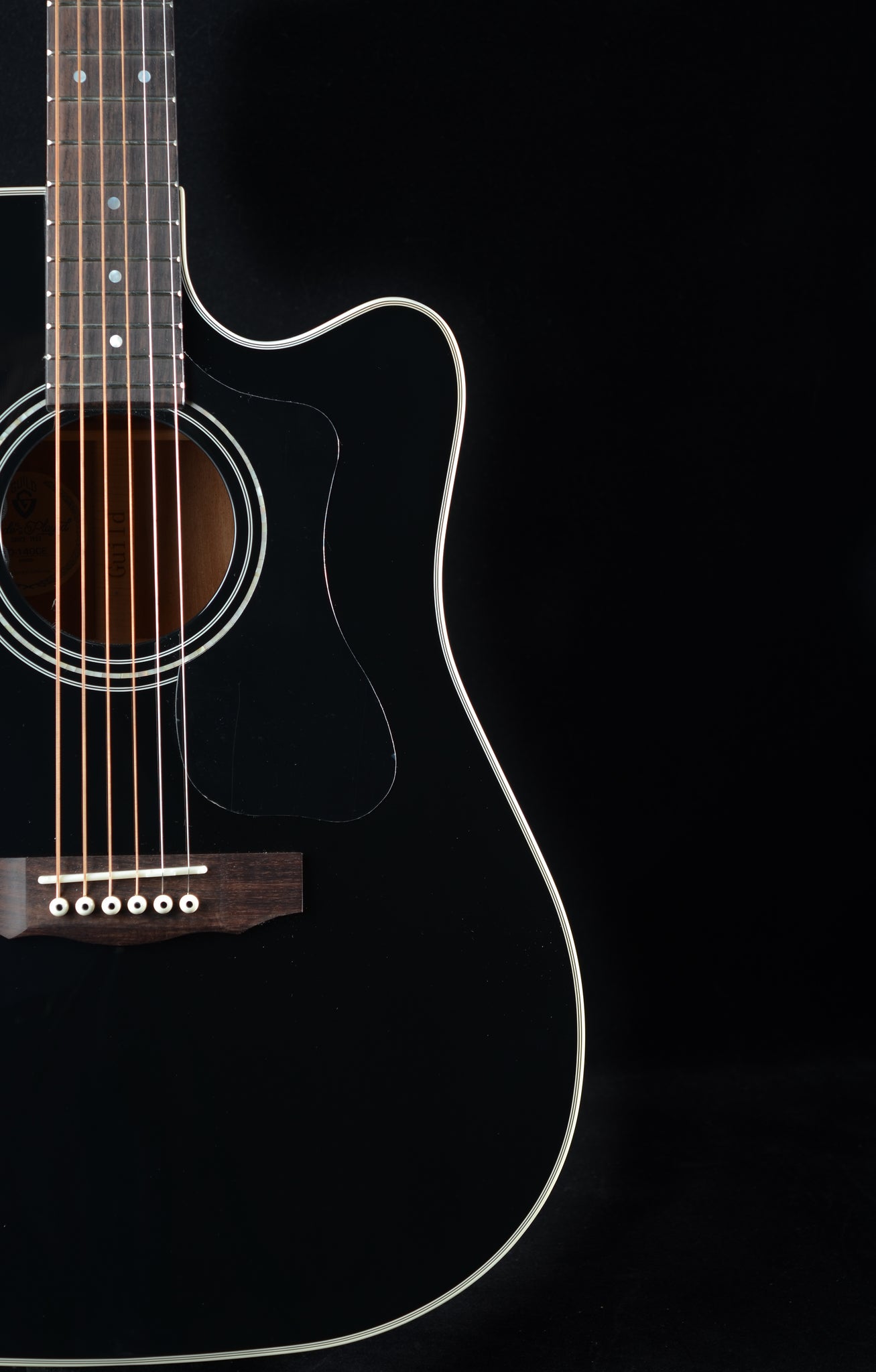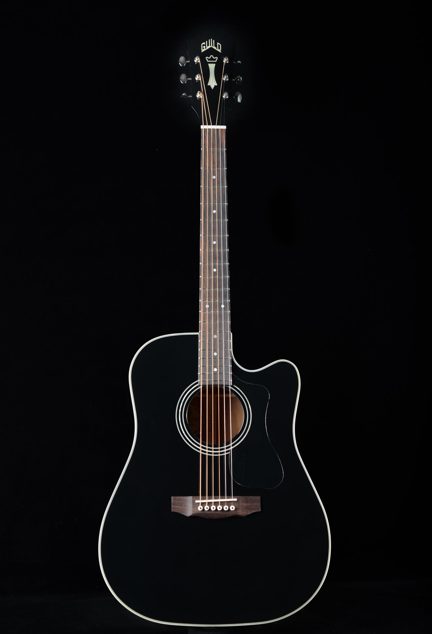 The D-140 models from Guild are performance-driven dreadnoughts with all the playability, tone, and vibe that have made Guild a go-to name for discerning players for over 70 years. The D-140CE Black adds a new color option to the ever-popular D-40 and D-140 lineup, pairing an eye catching black high gloss finish that contrasts beautifully with white binding and Mother-of-Pearl inlays in the rosette and headstock. Premium specs like all solid tonewoods, bone nut/saddle, a Fishman GT-1 pickup system, and Guild’s Premium quilted gig bag with microfleece interior make the D-140CE a professional level instrument packed with incredible value. This full-bodied and powerful dreadnought provides guitarists with a classic acoustic sound and balanced voicing from its all-solid tonewoods. Solid Sitka spruce for the top and solid African Mahogany for the back and sides are a prime combination, scalloped bracing and rosewood fingerboard and bridge give this instrument a punch and tonality that define the Guild sound.
